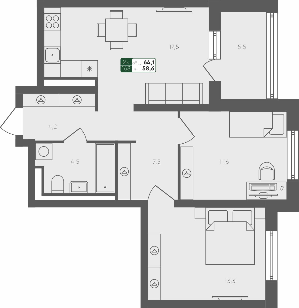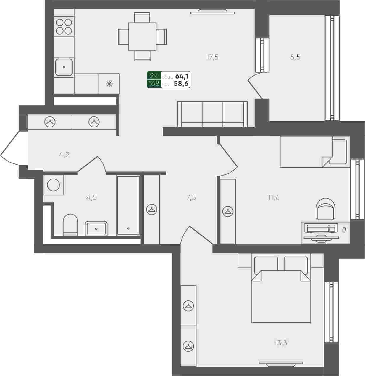 2-комнатная квартира, 64.1 м²