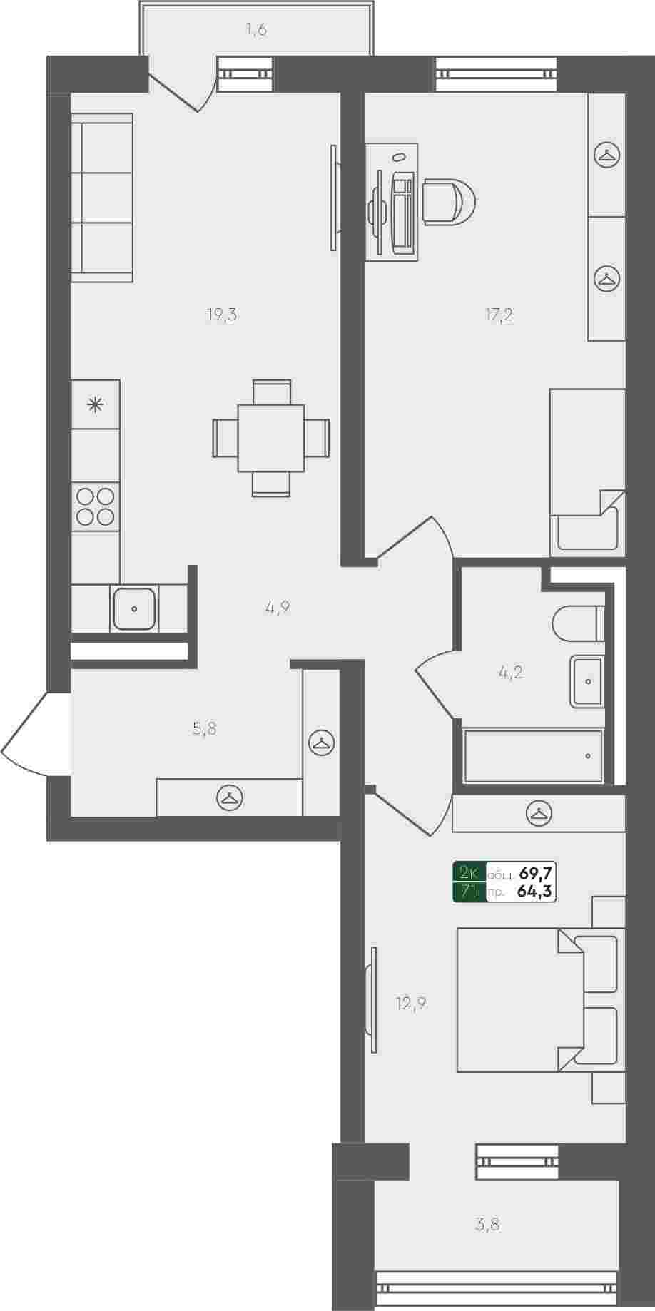 2-комнатная квартира, 69.7 м²