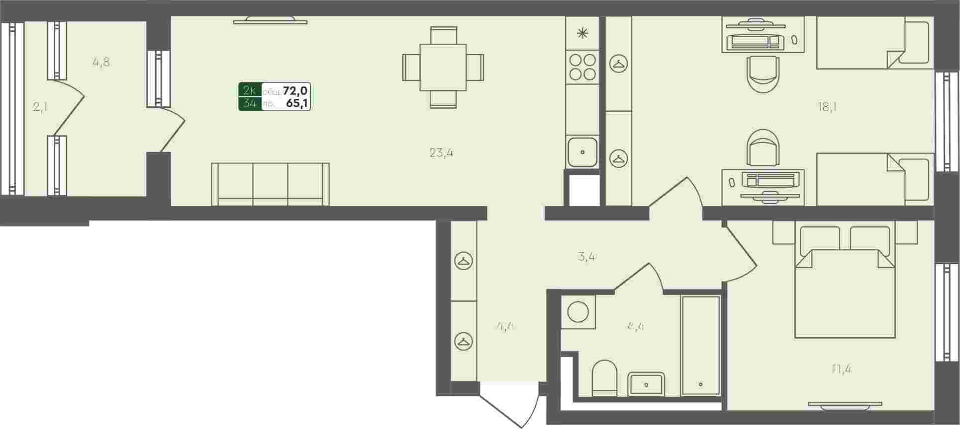 - 2-комнатная квартира, 72м²