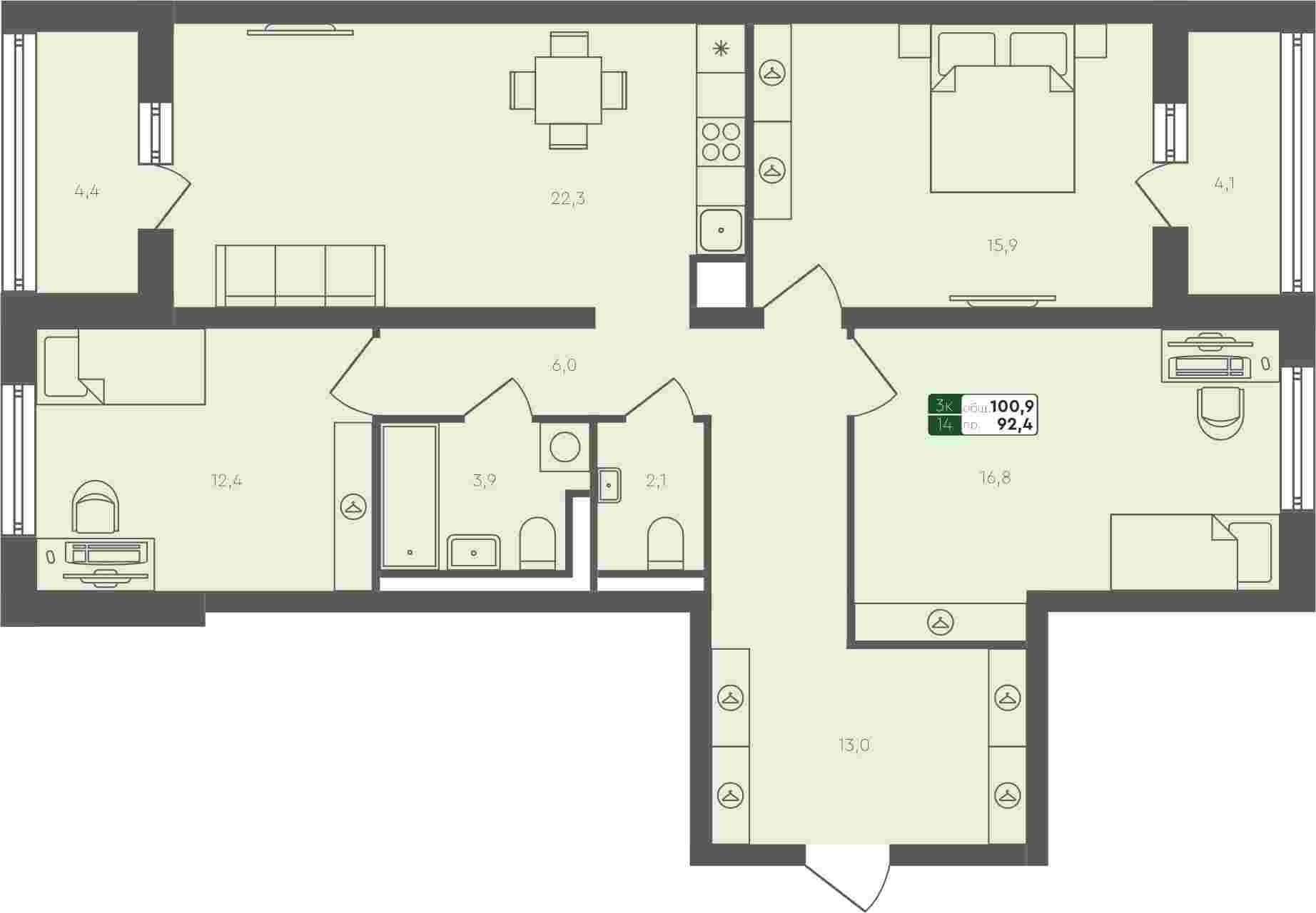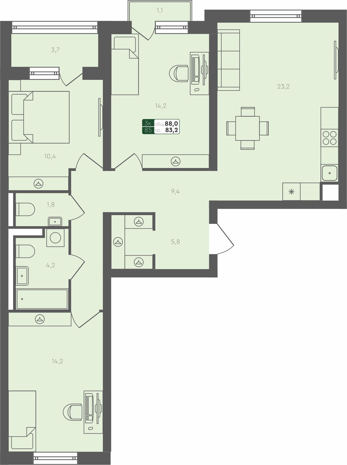 - 3-комнатная квартира, 88м²