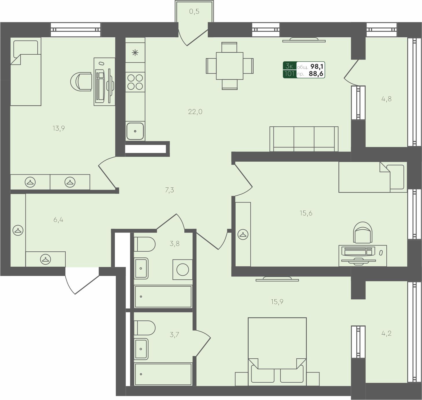 3-комнатная квартира, 98.1 м²
